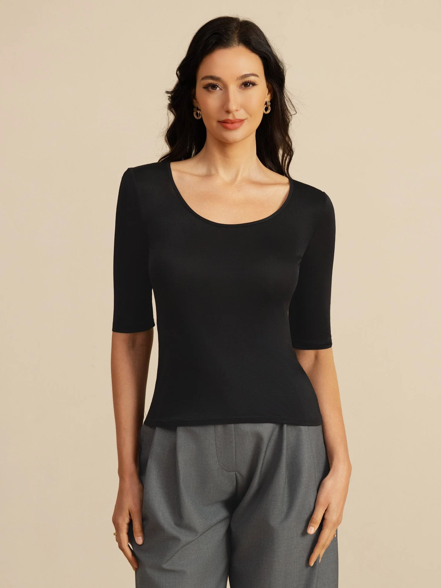 Confeccionado en seda 100 % pura, este top ofrece una sensación suave y transpirable con un ajuste ceñido y favorecedor. El escote redondo realza el cuello con elegancia. Su diseño en color sólido aporta un estilo moderno, limpio y sofisticado. Perfecto para el uso diario o para salir, combinando comodidad con una elegancia sutil.