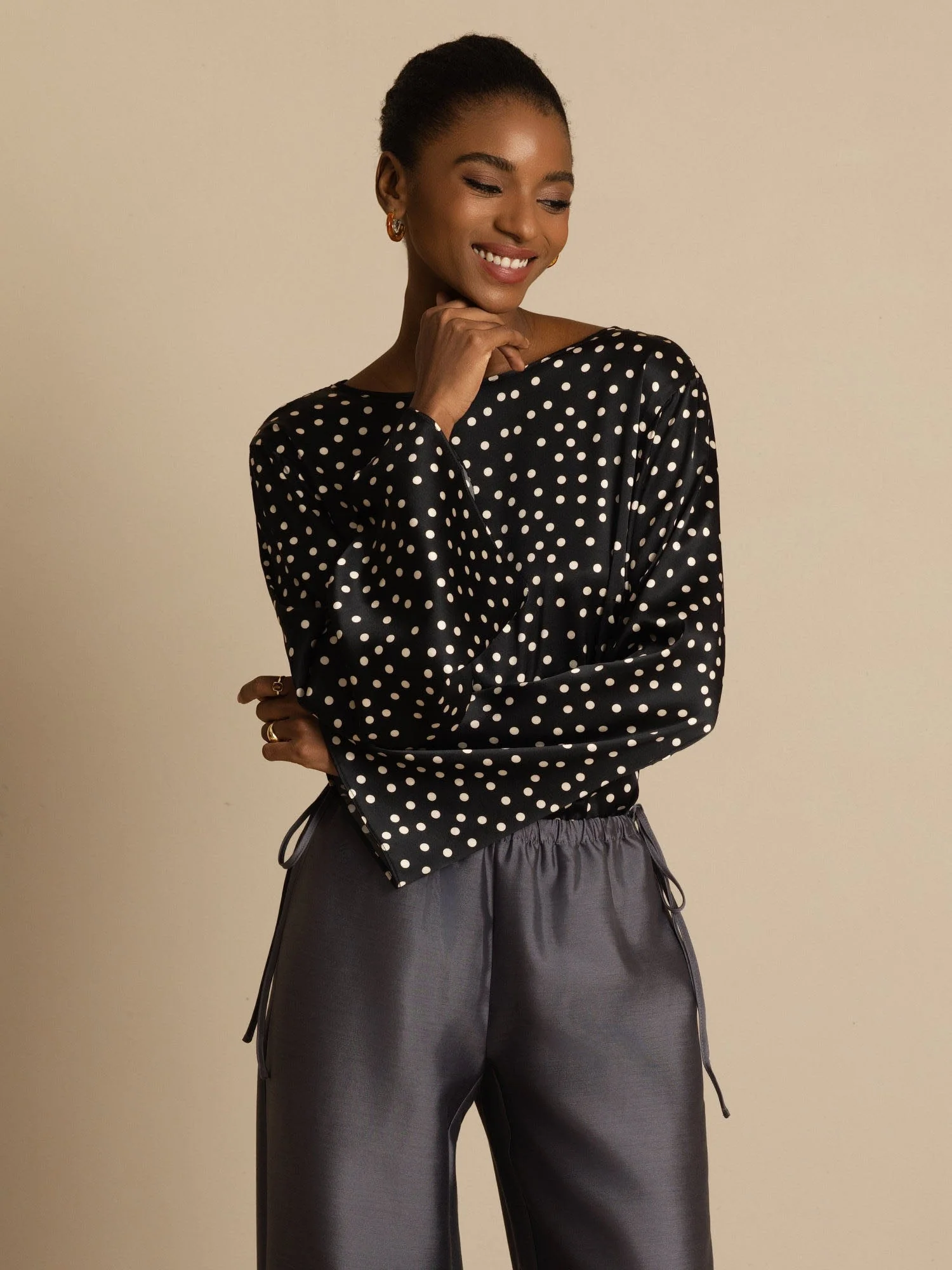 Detalles: Confeccionado con una lujosa mezcla de seda, este elegante top presenta un corte holgado con escote bote favorecedor, dramáticas mangas campana anchas y un estampado de lunares clásico. Se termina con una delicada apertura en la espalda con cierre de gancho, ofreciendo máxima comodidad y estilo sofisticado con un brillo sutil.